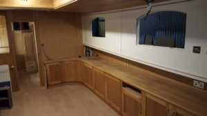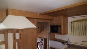 The cooker hood was a bit of a challenge as I really need it to vent outside so that it limits steam and smells from cooking. (We have to remember that nice as this is, the interior of the barge is still an open plan environment, so these things really do matter.) It could not go straight up because the wheelhouse was above it, so there had to be trunking to the side. The microwave unit also fits in really well.