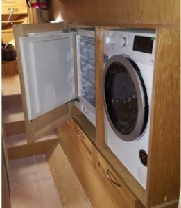 alongside the engine room showing the built-in freezer and washer/dryer installed. Alongside these is some wardrobe space, and in the base are some high capacity draws, so lots of useful storage.