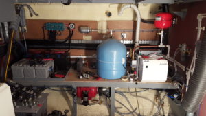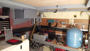 The forward hold now has the hydraulic bow thruster in place and is starting to be floored out. Later on I’ll see if they can set up a workbench for me. This is going to be such a useful storage and work space.