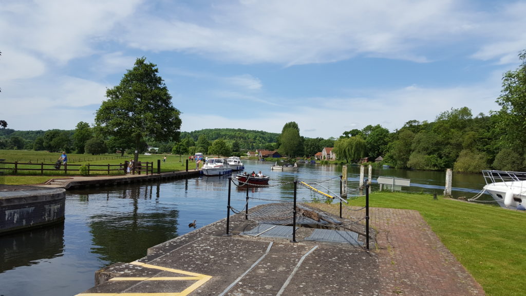 So on to Hambledon Lock, which was a lot bigger than Temple Lock such that as we approached it disgorged 8 boats into our face. Not as bad as it sounds as we were on the lay-by but traffic volume was increasing by the second. Still, we locked in and out quite well, confidence growing, and headed on towards Henley. We decided to moor up for lunch opposite Temple island and spent some time relaxing and watching the world go by, but eventually we had to push on homewards.