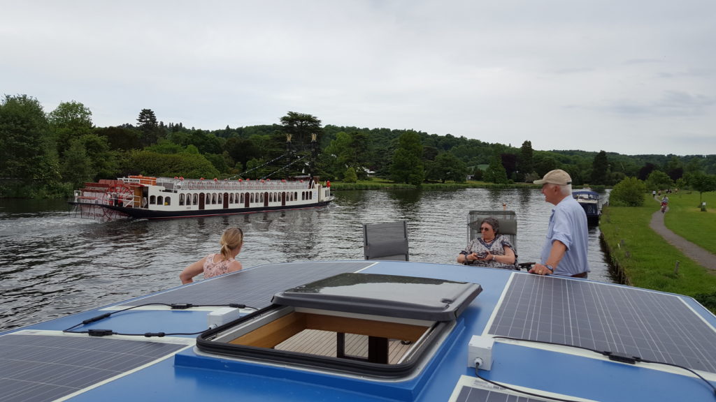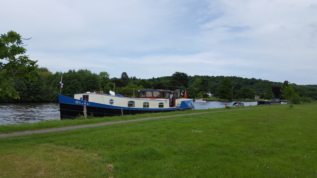 Today, Jane and Bob came over for a day out – the weather was perfect and there was no breeze, so no real excuse to not go out even if it was a Bank Holiday weekend. Being a bank holiday, it was busy and at times we had to work our little socks off. Coming out of Temple Lock was really smooth but we were immediately faced with three reasonably sized boats coming downstream all trying to fit into the same space under the bridge. Although they were travelling downstream they graciously waited for us to come through, not that there would have been any space for them as it was all a bit crowded round the lock exit.