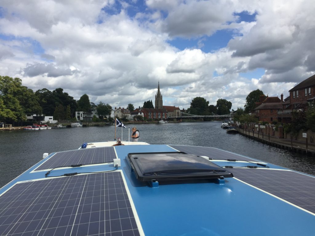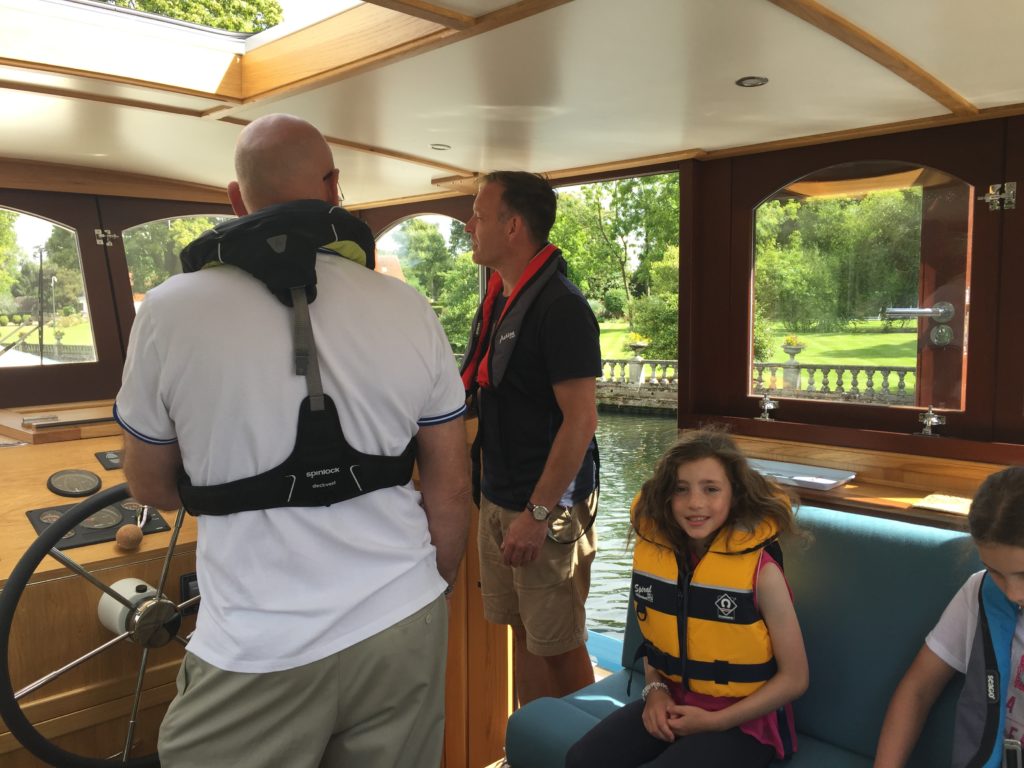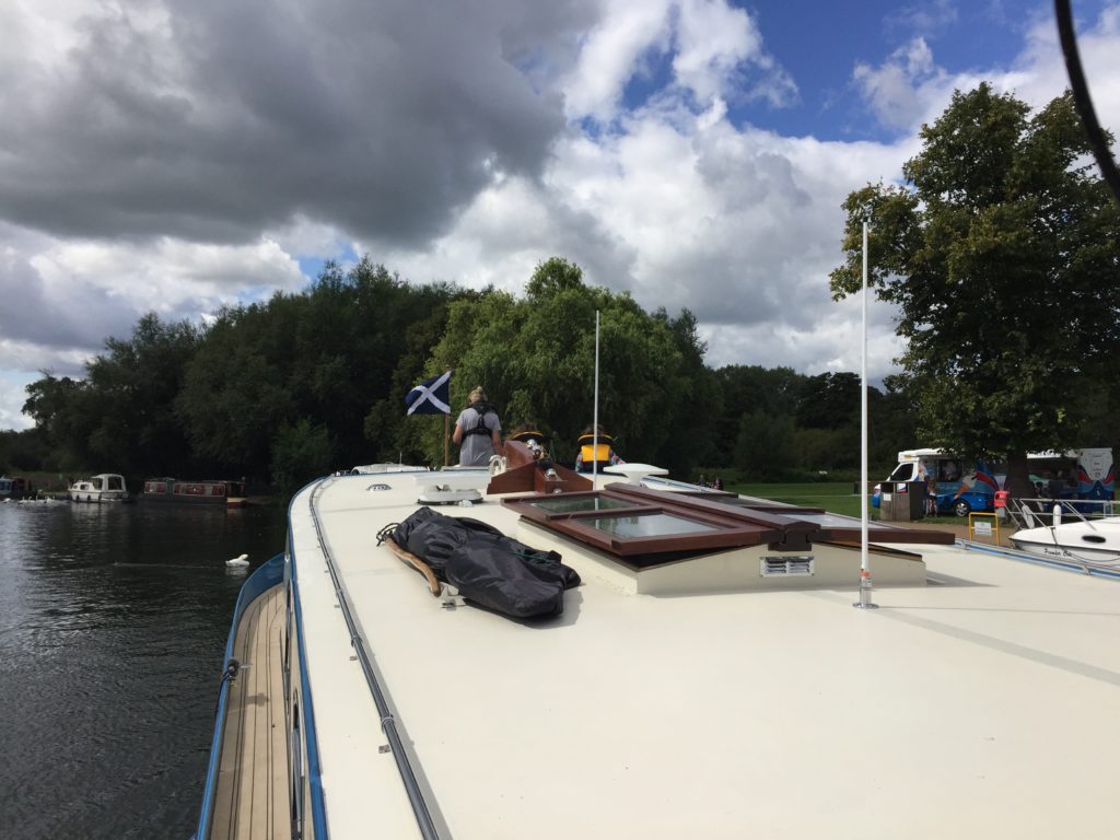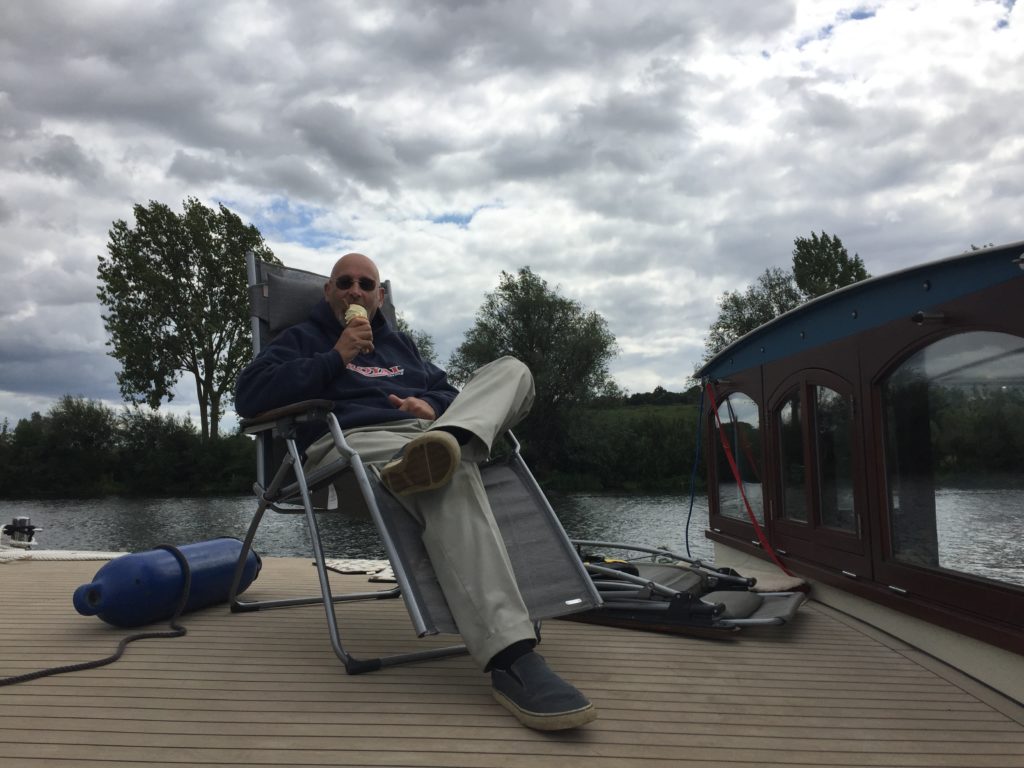 Today was probably the windiest that it has ever been for us out on the river and it was definitely challenging at times.  We moored up at Bourne End for lunch (with an ice cream van close at hand), and in the process we treated a passing barge-enthusiast to a tour of the boat.