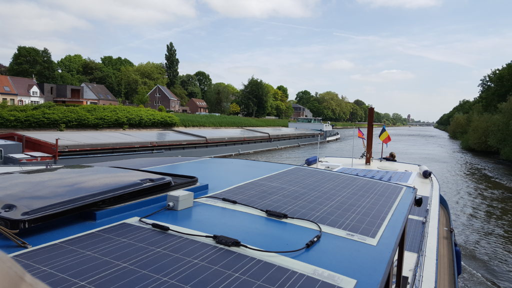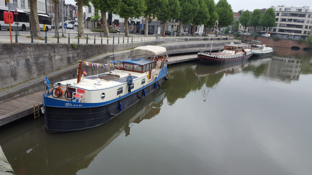 From here we started to transit round Ghent with more and more commercial traffic moving around us.  Whilst we had wanted to stop over, it did not seem like a good idea to moor up and expose ourselves to wash from these commercials, so we pressed on.  Heading towards another railway bridge and with our previous experience of railway bridges, I radio-ed through to enquire about opening – I thought they said it would open at 35 minutes past the hour, not that long away, so we hovered …. and hovered .. and hovered.  After 15 minutes of this hovering, we concluded that maybe they meant it would open in 35 minutes and indeed it turned out to be not much longer than that and off we went again.