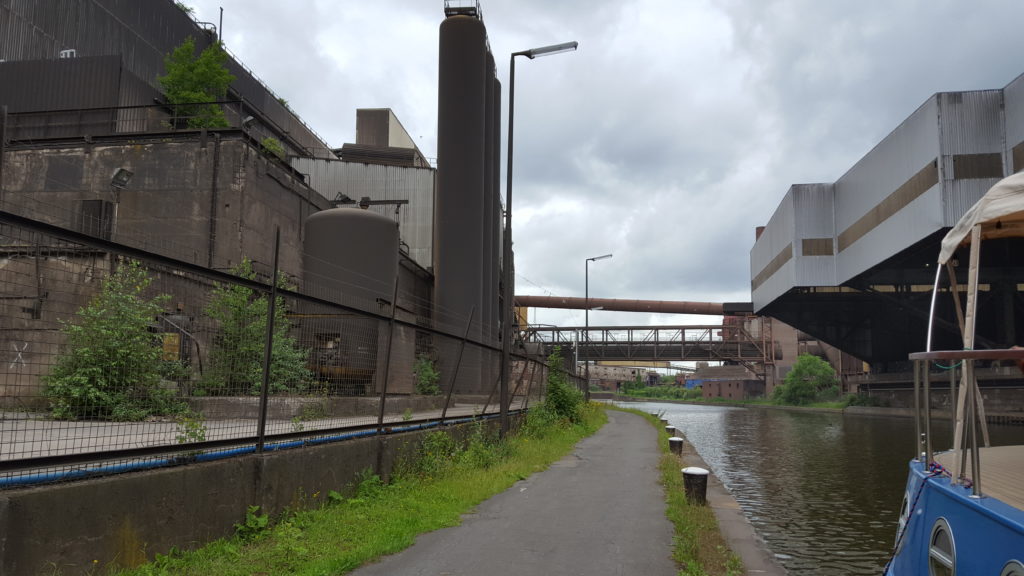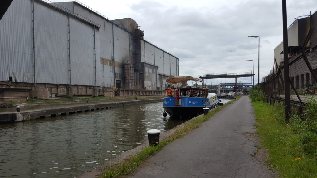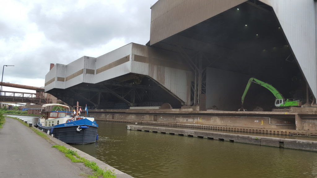 After Strepy the scenery was quite mixed with long stretches of wide open yet bland spaces. As we passed through Charleroi, the old industrial heartland, there was a never ending supply of recycling plants with large numbers of commercial vessels moored alongside. Fortunately for us we had ended up travelling this section on a Sunday and therefore there were no commercial vessels operating. This made the passage a lot simpler.