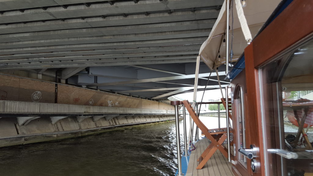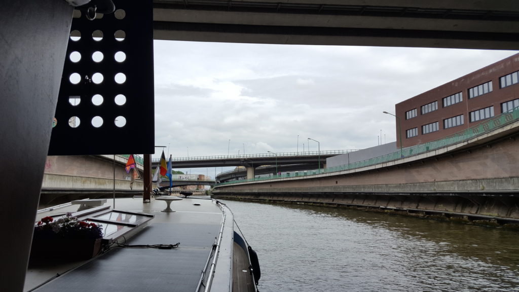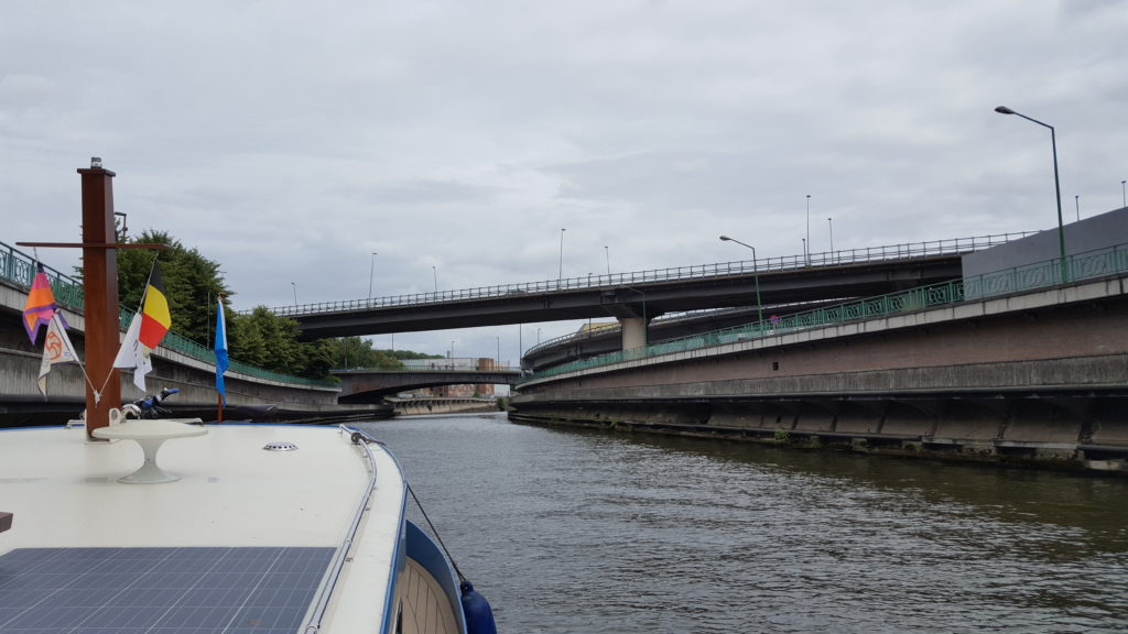 Travelling through Charleroi itself was quite sanitary. Solid high concrete walls either side and you could see that it would give a very clean passage for commercial ships. Signs also directed us to travel on the port side of the river/canal, and despite there being no other traffic, this was our first chance to deploy our Blue Board, which confirms to oncoming vessels that this is what we were doing. It was a bit of a wasted gesture but made me feel that the extra investment had not gone to waste.