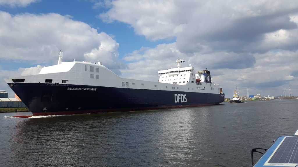 Because we would need to catch the tides, we were up even earlier today and, after a well earned comfortable night’s sleep we managed to be ready to leave at 8.10. Overnight the decks had iced over a little, but we were hopeful that they would recover as the morning went on as the weather was scheduled to be nice and warm later on. Anyway, off towards the GT canal again and on to the Terneuzen lock where we had to wait quite a while for entry to the lock, during which time a rather large commercial came along with a rather angry captain – it seemed that the little cruiser in front of us and us too were occupying the moorings in such a way that he couldn’t get alongside to moor, and rather than simply ask us to alter our positions he decided to have a real rant, mostly at the guys in front of us but we think we were mentioned too. Fortunately we don’t speak dutch so it just went over our heads! But being the nice people that we were, we moved our barge a little further back, followed by the cruiser in front of us, and the commercial managed to moor up. Aaaah, we could relax for a short while before locking in …. only to be approached by some workmen on the quayside who needed us to move forward so that they could get their work barge into place to start their work. Luckily we were able to squeeze forward a little and they were more than happy. As we waited to lock in, at least six large commercial barges turned up, along with several smaller cruisers, and we wondered how we could possibly all fit in. But we did! The lock keeper radio-ed us to advise that all the commercials would enter ahead of us, then we would be seventh followed by the cruisers. OK, they know what they’re doing, so we duly followed only to find that yes, we could fit in ….. down the centre BETWEEN the commercials. Slightly nervous, we did as we were told and moored up to one of the larger barges and crossed our fingers. Happily we survived with no damage and nerves still in tact, and left the lock merging onto the Westerschelde amid lots of even larger commercials moving swiftly past the canal entrance/exit.
