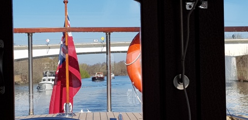 We set off at 8.30 on Thursday 4th April, with ice on the deck but the clear blue skies looked promising. We were stalled at the first bridge and asked to wait for a couple of cruisers to catch up and by the second bridge we found that we were now leading a small convoy that followed us on to Evergem lock.