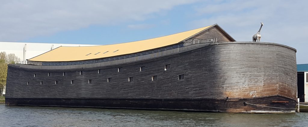 Leaving Dordrecht, we eased our way into the very busy waterway towards Rotterdam with a massive amount of activity around us until we turned off for Gouda (a Dutch city south of Amsterdam in the province of South Holland known for its namesake cheese and seasonal cheese market.) Along the way we encountered some of our biggest commercials yet – one being a pusher with two rows of three barges ahead of it – and then, to our surprise, what appeared to be Noah’s Ark, sporting a giraffe at both bow and stern moored up along the riverbank.