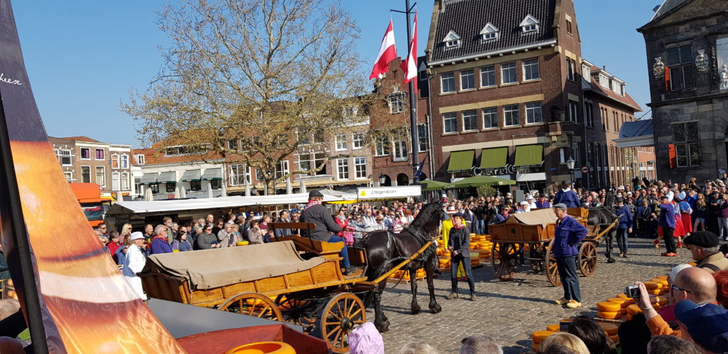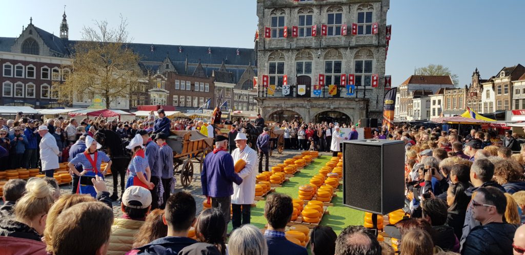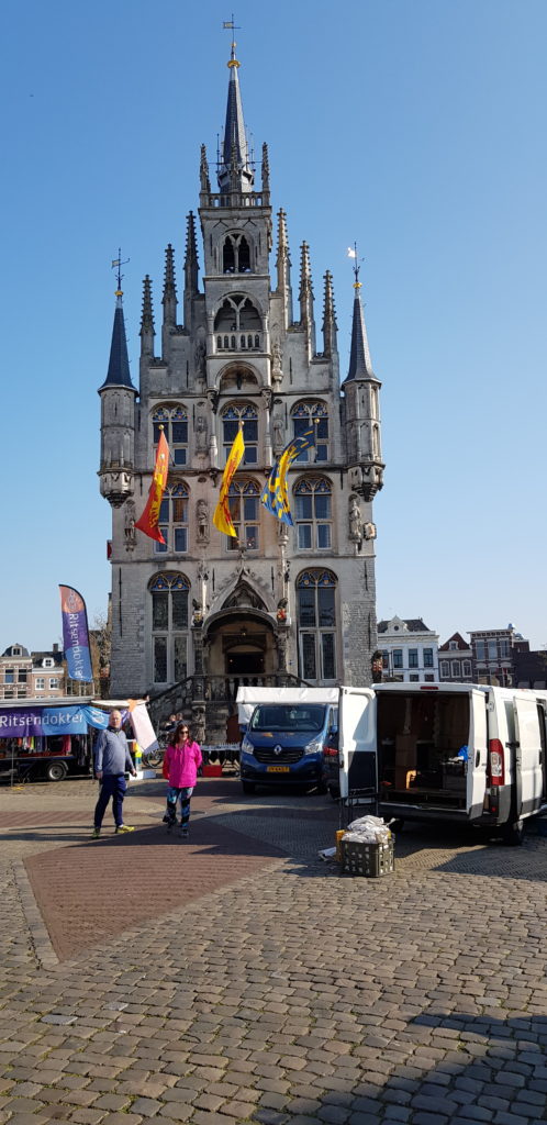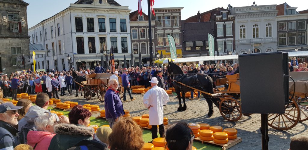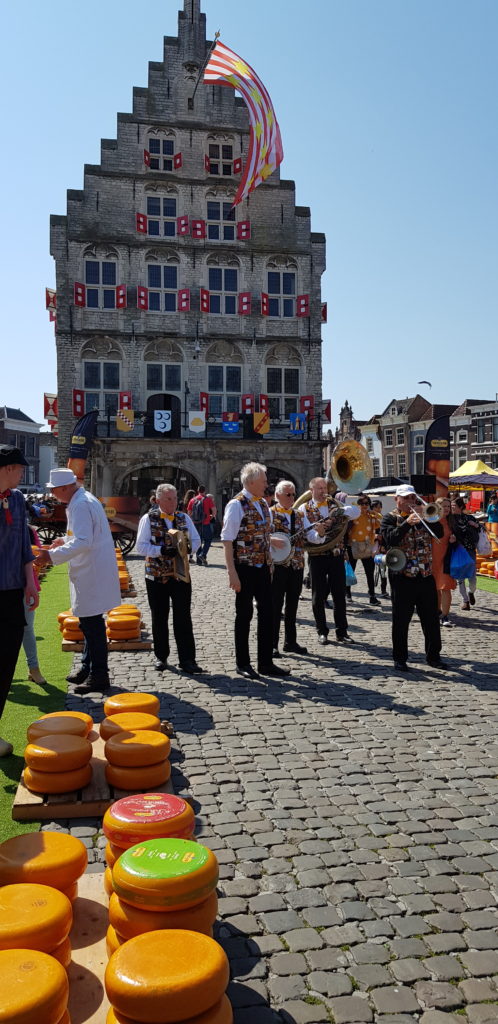 Our first morning in Gouda coincided with the weekly Cheese Market and its ceremony of the cheese market auction, so obviously we had to go along to check it all out and to buy some of the local cheeses, and of course to sample them. It was all very colourful and there were lots of visitors to the town enjoying the spectacle.