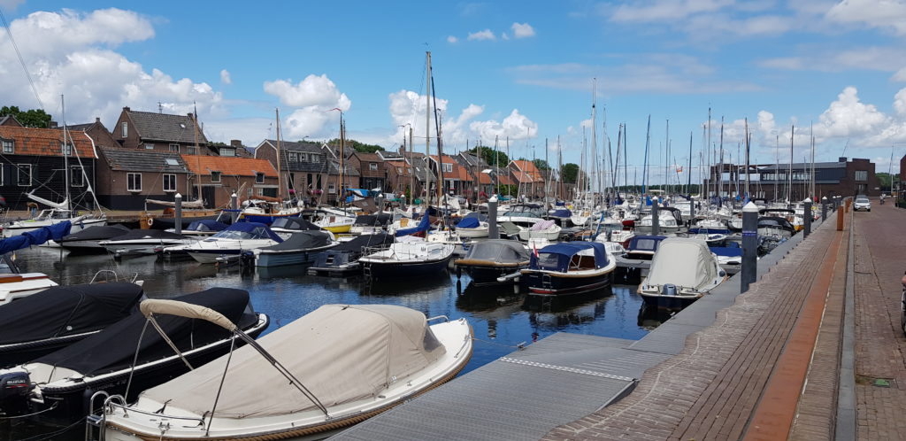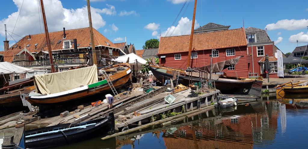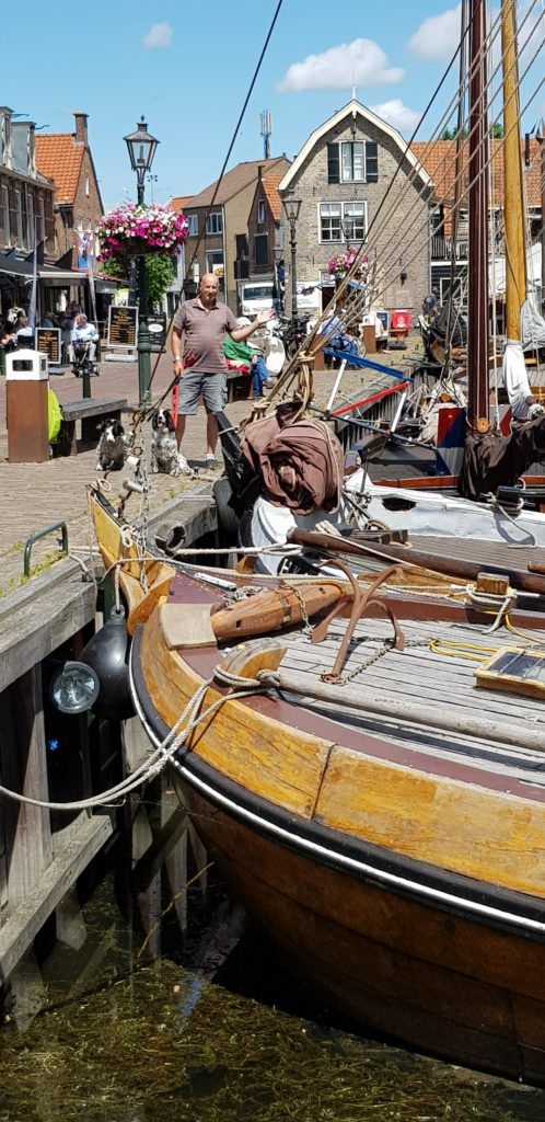 Today we arrived in the historic town of Spakenburg whose major claim to fame is the restoration of historic Dutch barges, and found a nice mooring outside of the Havenkantoor’s office, with a large grassy area just right for the dogs, and spent two nights here (although fairly expensive and no services included). A short walk into the pretty little town, almost chocolate-box in itself, took us alongside the harbour area where the older dutch barges, tjalks, etc. are cared for and we could see the sheds where some of the work took place although it didn’t appear to be that we could actually look inside.