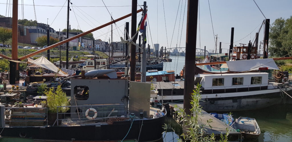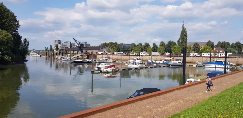 Nijmegen is the oldest city in the Netherlands and the marina was a bit strange, slotted into a small area near the main bridge. I certainly had my doubts about getting in there so we phoned on the approach and the harbourmaster confirmed that it would be OK to moor, and indeed was waiting for us and directed us in. I thought he was joking when he pointed out our allocated spot because the perspective did not give the impression of any free space, but sure enough we slotted in between older barges with ample space to spare. And the plus side was free electric and water, and it was a standard E15 per boat/night, bonus.