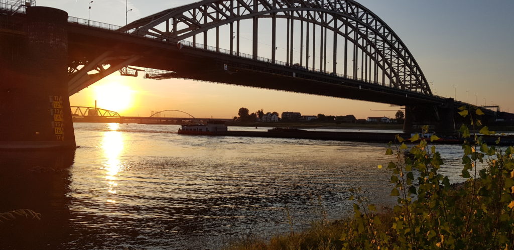 Leaving Doesburg, we were faced with the last stretch of the Ijssel and the increasing flow against us, but with the anticipation that when we joined the Waal, the current would be in our favour. Most of that day was a struggle but then we started to fly as we joined the Waal, although it started to get stupidly busy with commercial traffic! Here we were able to really get value for money from our blueboard – because of the size of many of the commercials and because of the bends of the river, a lot of them were using their blueboards to change the side they wanted pass you on. Ours was going up and down like crazy to acknowledge their actions. Whilst I thought I understood the rules, a new dimension made me question whether I actually did as, faced with two large commercials bearing down on us, one with and one without a blue board showing, I ended up going between them. This turned out to be the correct course of action but it really didn’t feel like it at the time.