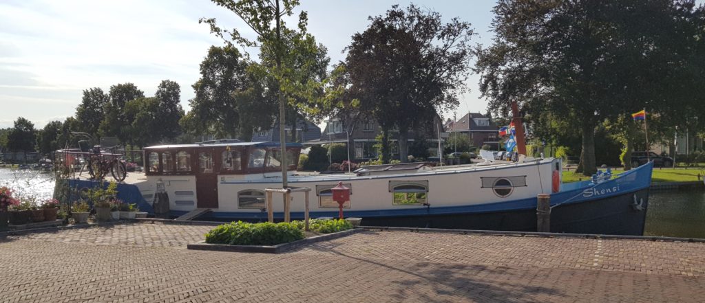 Now on the Amstel and heading south, we had to be constantly alert for all the many rowers out and about, and then as we approached Ouderkerk, the bridge keeper came on the radio to advise us that there was work on a new bridge a little further along which meant that the channel was closed for a couple of days. (Unfortunately this hadn’t been flagged by Navigo). We asked if there was anywhere we could moor up nearby but didn’t get a response, but then a commercial contacted us to say he was on his way to the bridge and we could raft up to him if we needed to – what a nice gesture. However, not far from the bridge we luckily spotted a vacant mooring space that was just about able to accommodate our length, although without any bollards we had to put pins into the bank and attach to a nearby signpost.