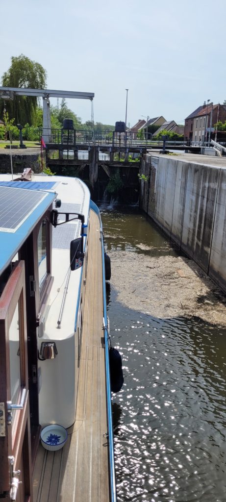 We were ready to leave fairly early the next day, but at the first ecluse we encountered, we had to wait for a double length commercial ship to pass before we could carry on … there was no way we’d have wanted to argue with that big beast.