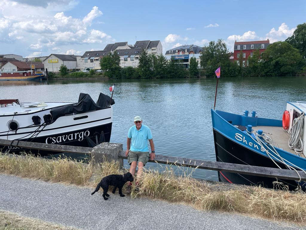With great trepidation, the following morning (6th June) we crossed the border into France at Pont de Mortagne and made excellent progress all day, ending up at a public quay at Pont de l’Abbatoir, Waiverchain on the Escaut. (Unfortunately as we travelled Casper became unwell with a very poorly stomach – possibly caused by his habit of scavenging and combined with the very, very hot weather that has set in – so he/we had to suffer his discomfort and anguish, spending quite a bit of an otherwise pleasant journey on clean-up duty.)