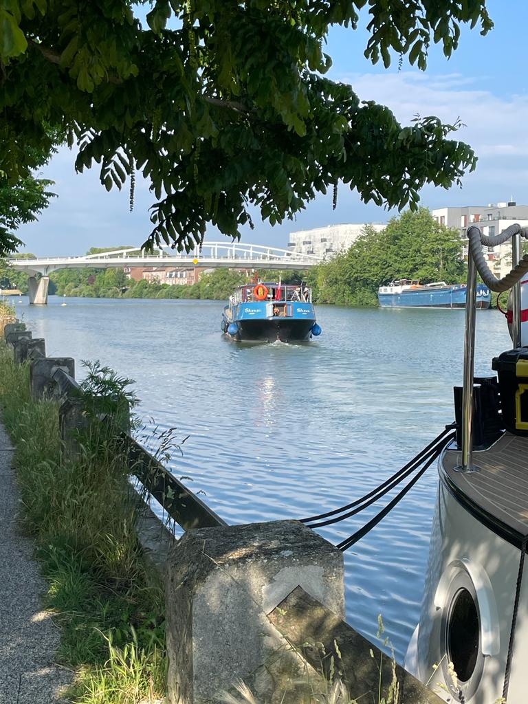 We made our way further along the river the next day, spending the morning cruising towards our planned mooring on the Quay de Persan/Beaumont sur Oise, where divers were making practice dives very close by. The mooring was along a pontoon, and Czavargo arrived a little later, mooring up just ahead of us.