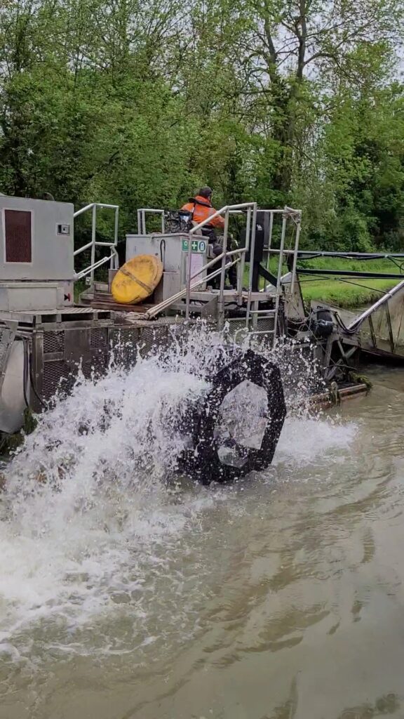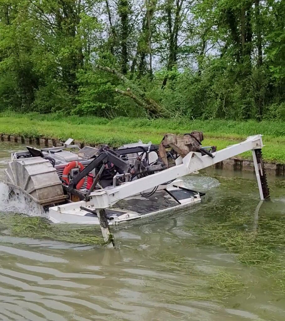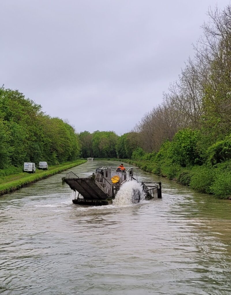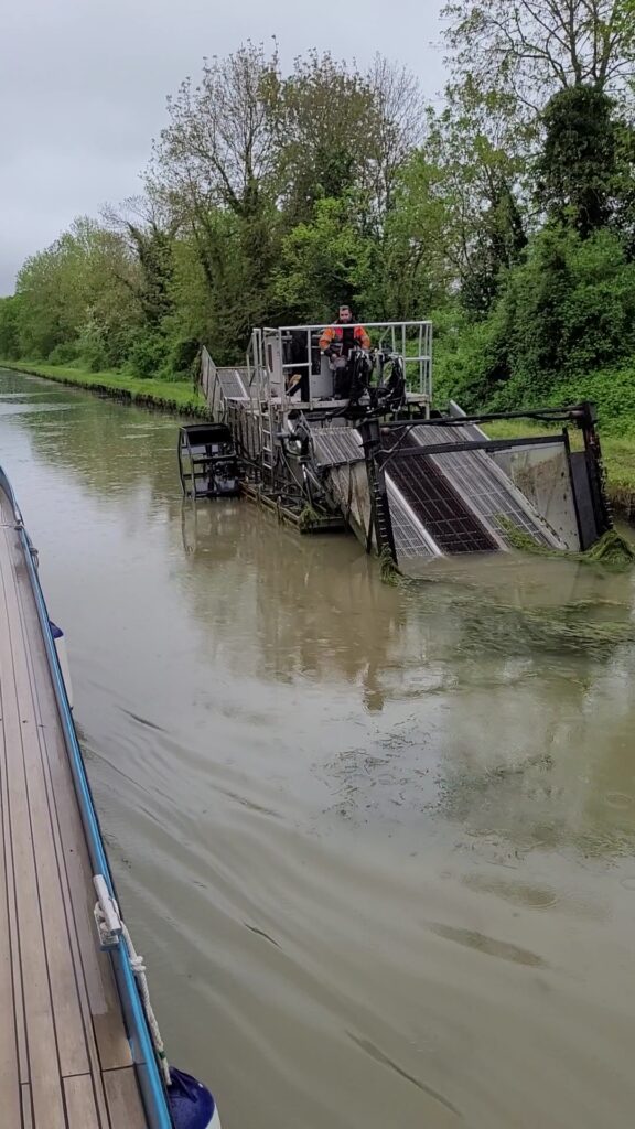 Waking to a very briefly drier day, we set off at 9.15 and headed towards Tonnerre some four hours away, but the weather quickly deteriorated for the rest of the day. However, today’s real excitement came not too long after our start, when we encountered two machines in the water, dredging and removing the masses of weeds.