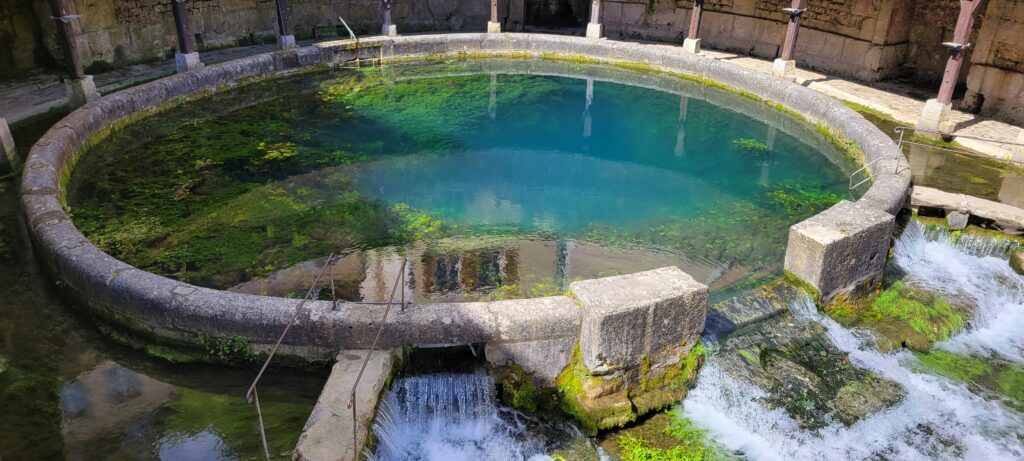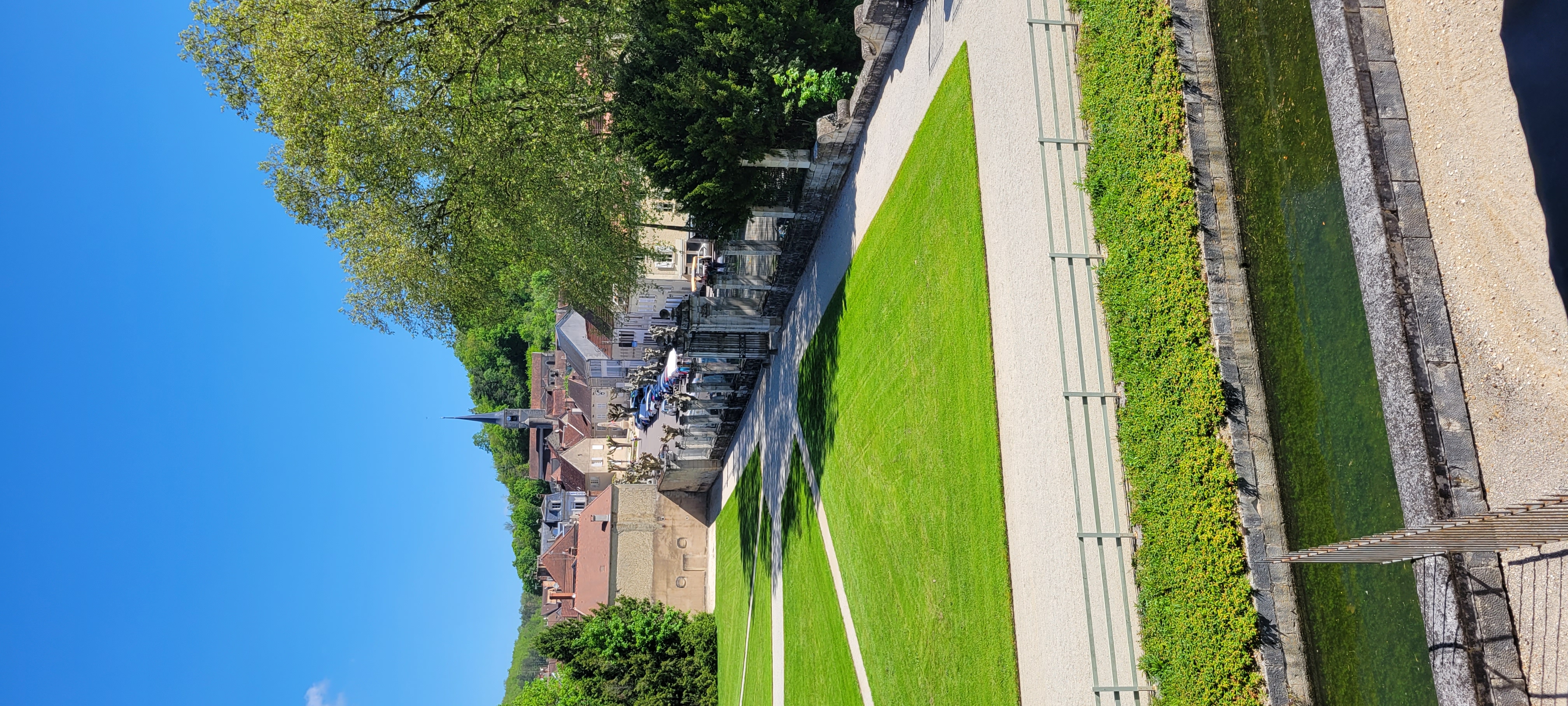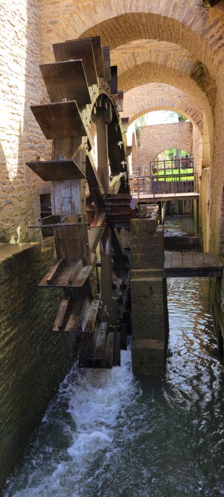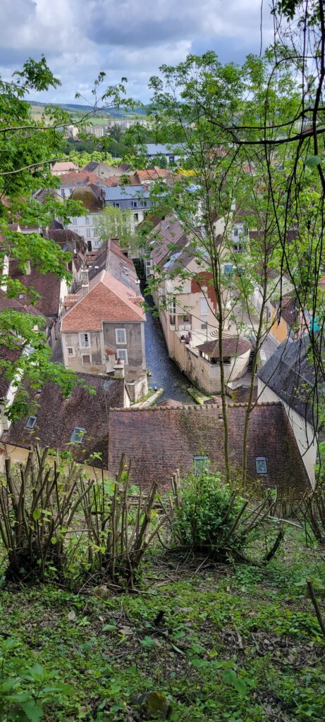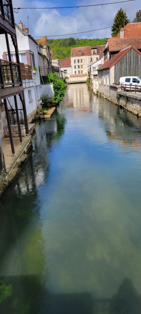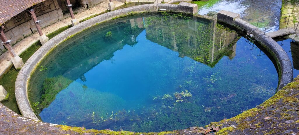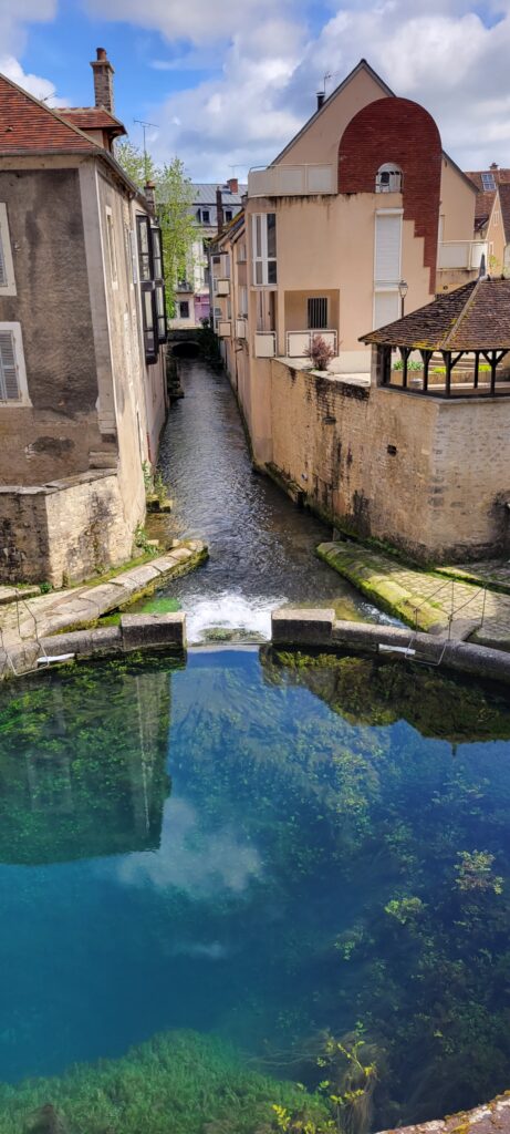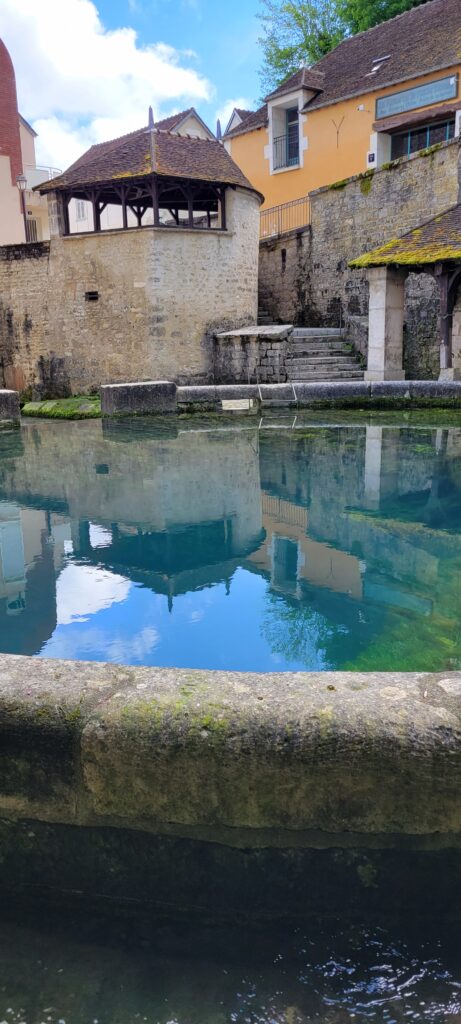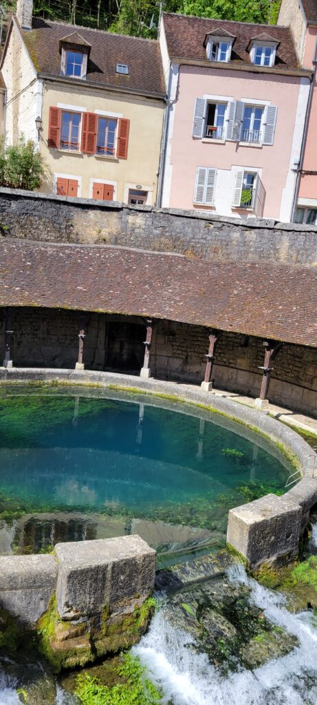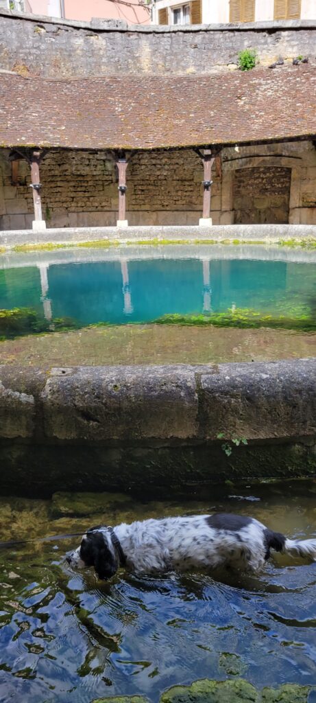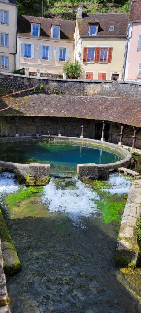 After securing ourselves along the canalside, we popped into the Capitanerie/restobar for a snack and coffee before heading off to stock up at a nearby Aldi. Then a nice walk in dry, warmer weather, followed by dinner, TV and bed. We decided to spend our full day in Tonnerre sightseeing, and the town held a few delights for us, but particularly the Fosse Dionne which was pretty exceptional – apparently it is a seemingly bottomless spring-fed pit that gushes 311 litres of water every second. The Romans used it as a source of drinking water; and later the French enclosed it in a circular stone rim with an amphitheatre and then in the 17th century it became an elaborate public wash house.