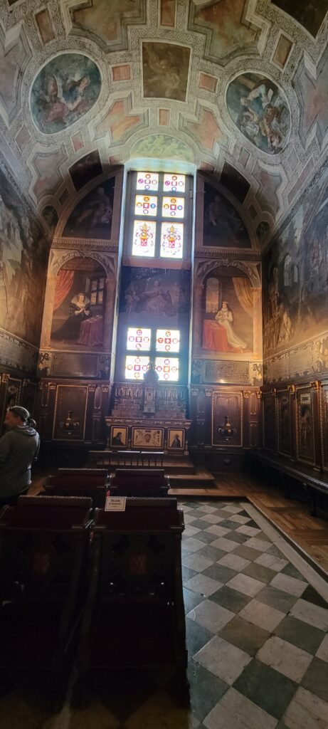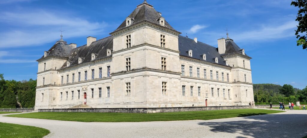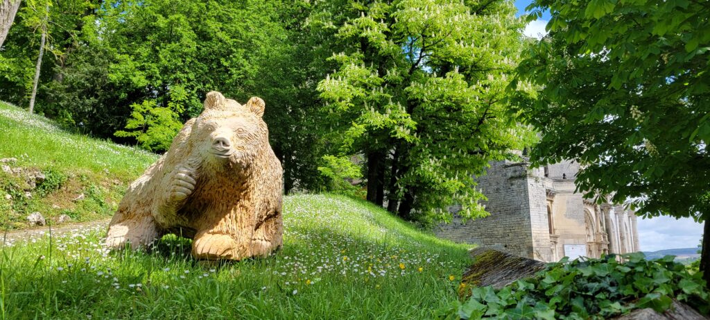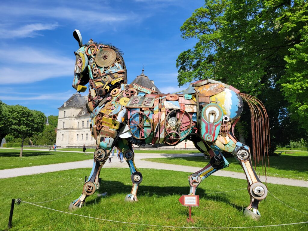 The following are various shots of the lovely Château in Ancy-le-Franc (luckily this was open despite tge bank holiday), showing some of its stunning interior and the well tended grounds, and where we came across an unexpected metal sculpture of a horse. It seemed that 2024 is also given over to a Playmobil exhibition “From Fine Arts to Playmo’Art” with several of its rooms given over to scenes of art history, including some recognisable characters such as Vermeer or Da Vinci in giant Playmobil, a reconstruction of a scene from Molière and other operas, Gothic art, impressionist art, modern art, sculpture, architecture and paintings from Antiquity to the present day, and all areas were shown as a giant Playmobil, as a painting or as a diorama.