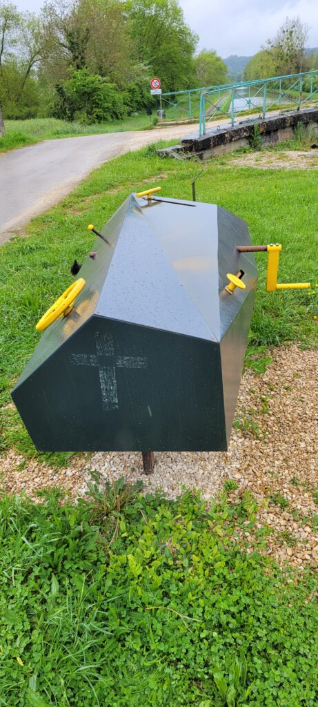 In the morning we were ready to move off for a 10 am meet at the first ecluse (95Y Tonnerre), starting off in heavy rain which sadly lasted the rest of the day. Still, with the able assistance of our eclusiers we passed through the following three ecluses (94Y Arcot, 93Y Arthe, 92Y St Martin) and into ecluse 91Y Commissey where we were left during the eclusier’s lunch hour. Stopping at Ecluse 94Y Arcot, we noticed a strange metal box on the side of the lock, and on asking the eclusier about it, we were told that it was an éclusophone – a musical instrument made up to include a crank, a drawbar and a resonance box, which produces bizarre, melodious sounds, designed to echo the sound of water, nature and the lock.