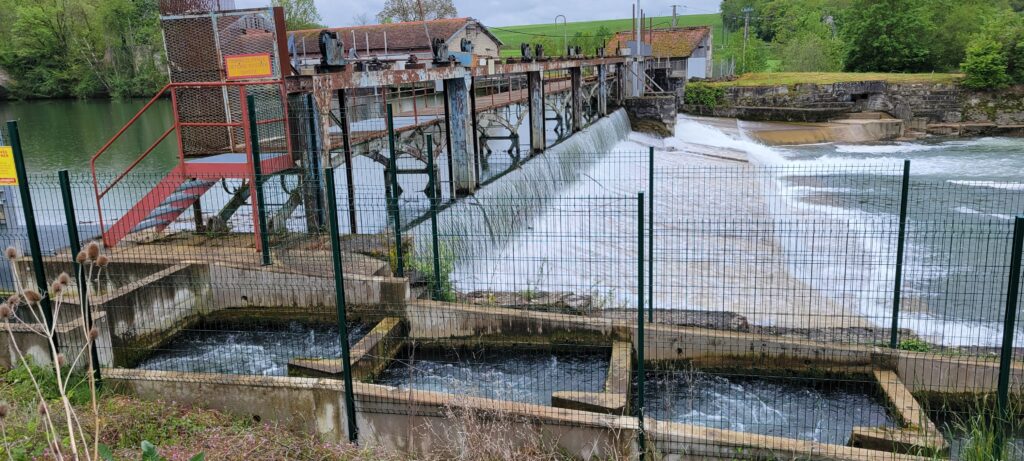 Further along the canal at ecluse 91Y, I briefly left the boat to check out a nearby weir on the Armançon river which oddly seemed to have a built-in salmon run alongside it, although I could find no information about it.