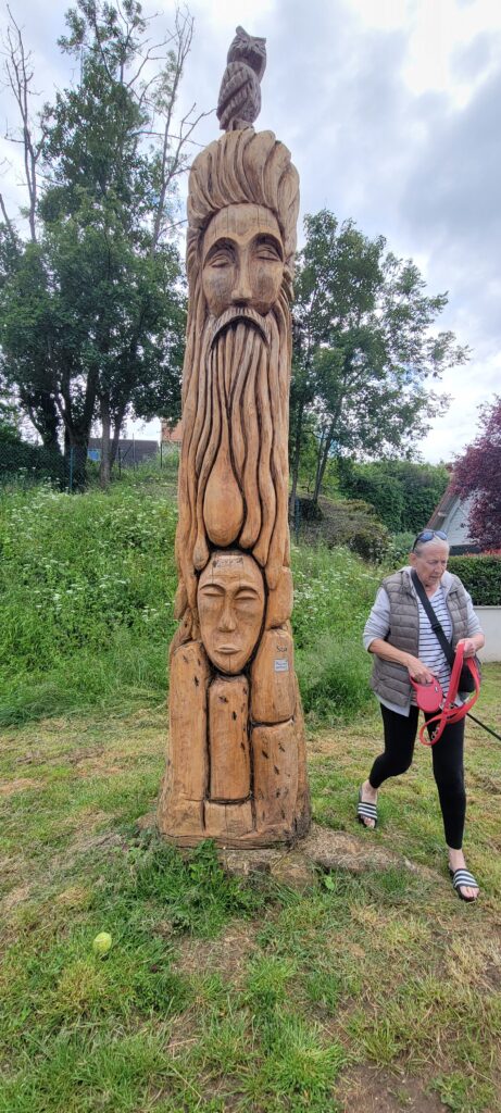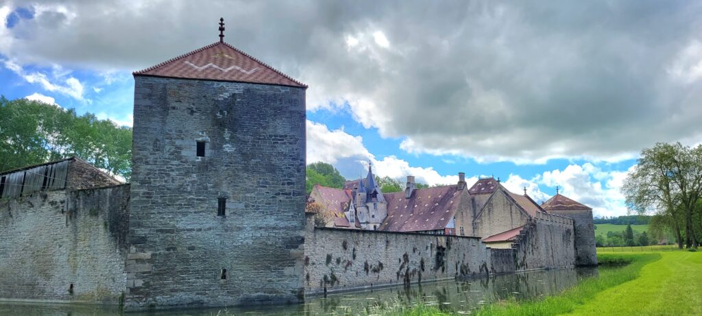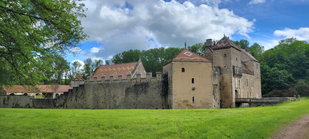 Our full day in Marigny le Carouët started with a walk into the small town, all very charming and picturesque, well tended and loved, on our way to visit a nearby chateau (referred to as a ‘fortified house’) surrounded by it’s own water filled moat, built in the 12th century on the site of a Gallo-Roman villa. It is now privately owned so you can only walk around the grounds external to the moat, but nevertheless it was very impressive – the roof tiles had lots of symbols built into it along with lots of yellow tiled patterning.
