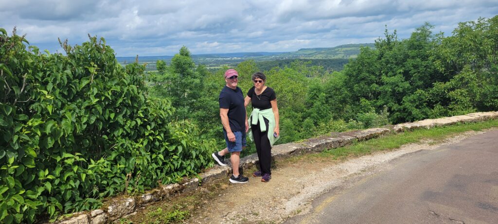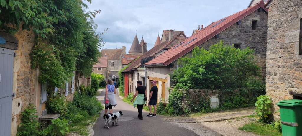 Some 105 minutes from our entry into the tunnel we exited the other end of the tunnel, thankfully in one piece if somewhat stressed! Thank goodness for the absolutely essential support of Tim, Glynis and Nicki, all throwing advice at me from all directions (including Nick’s never-to-be forgotten “bow to stern” instruction). The weather was now beautiful sunshine as we turned into lovely clear water of Escommes where we quickly found a mooring spot where we could re-assemble the wheelhouse before continuing. Mind you, almost immediately another boat pulled in behind us (one of seven that were part of a rally heading in the opposite direction to us) and the skipper was quick to question how long we’d be there (several times over) as the other six boats were also arriving shortly and they would need to moor there once they’d passed through the lock into the pond (basically, we were in the way). No pressure!! Luckily our task wasn’t too arduous and we were quickly on our way, only having to wait for the seventh and final rally boat to pass us as he exited the lock. Another eight locks on and we passed onto a mooring in the pretty little area of Vandenesse en Auxois, with an added bonus of a stunning sight of the chateau of Chateauneuf looking down on us. Here we again caught up with Ian and Caroline and arranged to have dinner with them that evening. But first the four of us stretched our legs with a walk into the very small village and along rural roads before returning along the canal path. Later on, Tim and Glynis returned to Pouilly en Auxois to collect their car and bring it along for the next stage of their journey – they each took one of our bikes, but that ride was very short lived when the rear wheel on Glynis’ bike became loose and they had to bring it back. In the end, they decided that Glynis would run the approximately 10K route and Tim would cycle with her, and besides a few hiccups with going the wrong way, they eventually arrived back with us.