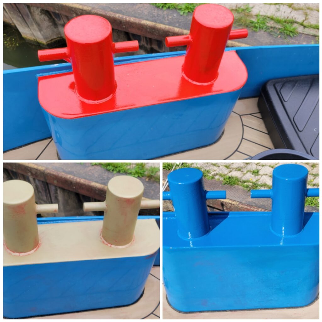 This time round, when Nicki found out that we had some red paint left over from when the red stripe was added to the hull, she thought it would be nice to repaint the bollards red. No problem, I thought. However, I didn’t have any original second part available, so I used some from another supplier ….. so there I was again, with the not-quite-right mix, which meant that five days later the paint was still tacky. In fact, testing with a bit of white spirit showed that the new paintwork would easily rub off. Aaaaaargh. I was left with no choice but to clean it all off using a horrible process that took me a whole day.