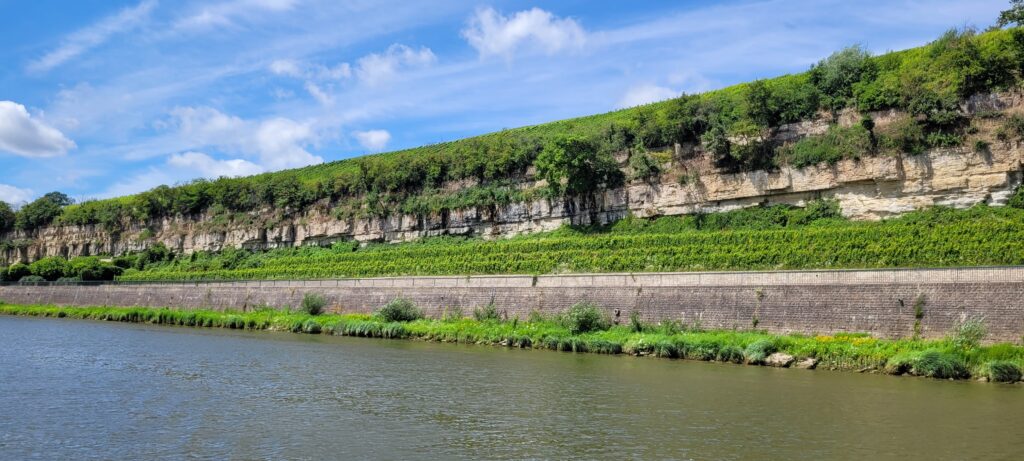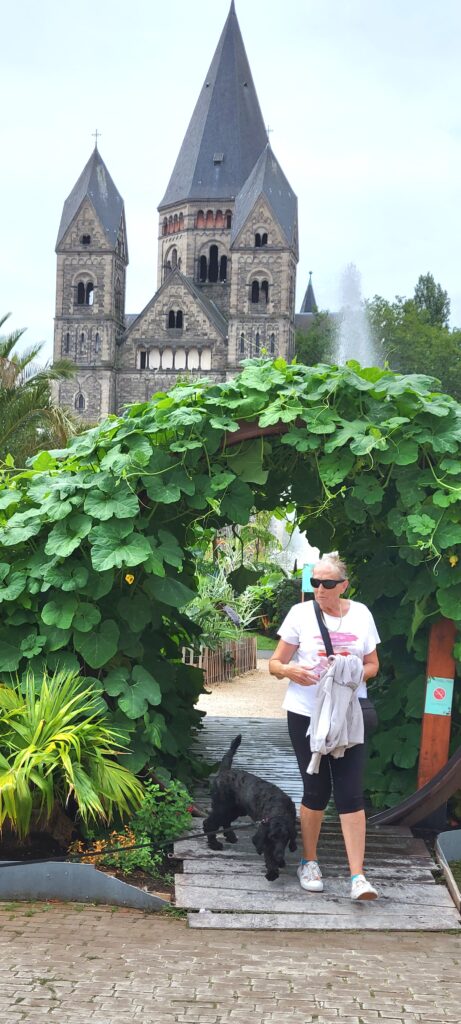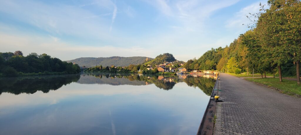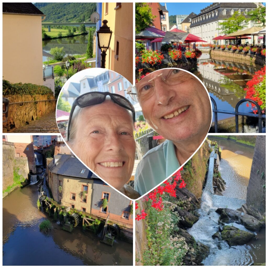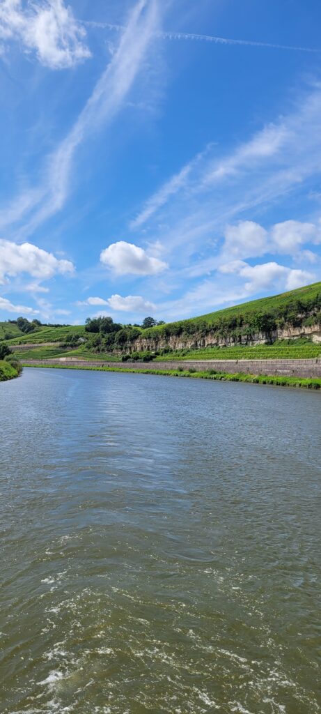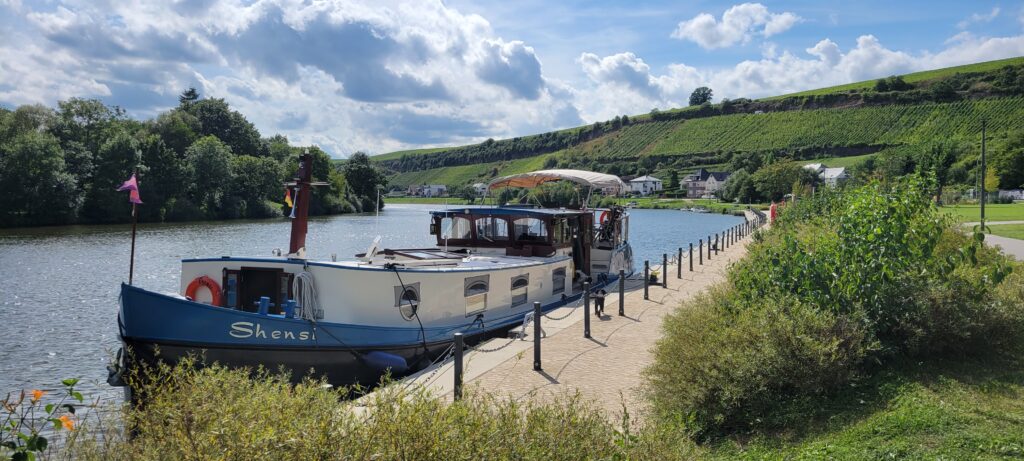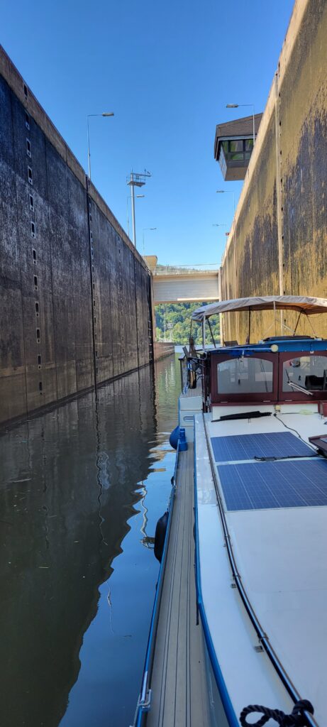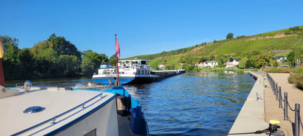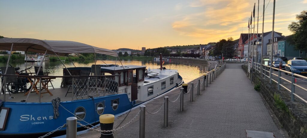 During the evening, Nicki walked the dogs across a nearby bridge into Germany (but only a few metres across the border) before turning back into Luxembourg and taking the dogs for a walk along a tributary river just round the corner from us. Later that evening a river cruise passenger ship came along and asked if we could move for about ten minutes whilst summer passengers disembarked, so we quickly ‘de-roped’ for them and just held back a way until they left. All very painless, and we were back in position and tied up again well within the ten minutes.