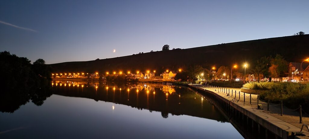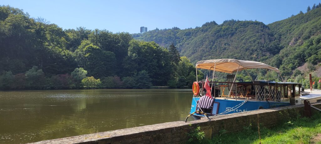 The next morning, we slowly meandered along this pleasant river travelling through some dense forest when in the distance we could see a structure looming out the skyline. On searching, it transpired that it was in fact an “elevated wooden bridge through a forest path, which ends at a lookout tower with striking views” at Saarschleife in Germany. A little further on we found bollards along the riverside, just enough for us to moor up overnight, and we pulled up thinking we would walk up to visit the area.