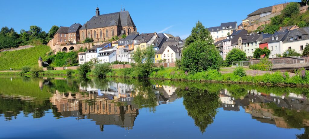 Now on 11th August, today we left the beautiful scenery surrounding the Moselle, and joined the Saar river, mooring up about a kilometre from the town if Saarburg, taking a nice walk along the canal into the town once it became cooler in the evening.