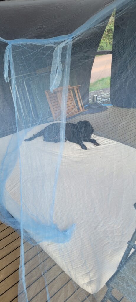 At some point during the day we decided it would be a good idea to sleep out on the stern deck in the hope that it might be cooler for us. With a little relocating of all the tables, chairs and bikes, we managed to make space for a double mattress topper, surrounding it with a large mosquito net, before we bedded ourselves down and even dropped off to the sounds of various nighttime creatures, twittering and hooting, and moving through the forest. The dogs were slightly confused with this new sleeping arrangement, but more than happy once they realised just how close they could be to us (extremely close, as it turned out).