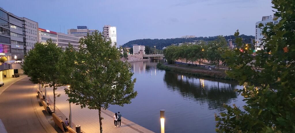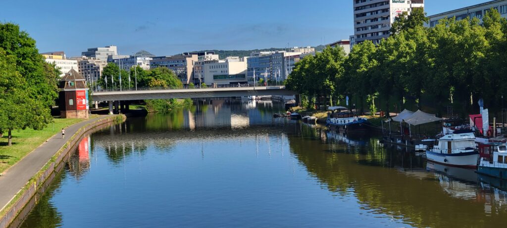 After some intermittent rain overnight, we were very pleased to wake to a cooler morning, and began today’s journey to the town of Saarbrücken – coming across an Aldi supermarket on the riverside with mooring nearby. We quickly pulled over to take advantage of this shopping opportunity – it’s not often that we have a mere 100 or so metre walk carrying lots of heavy shopping back to the boat, so we were very happy with that spot.
