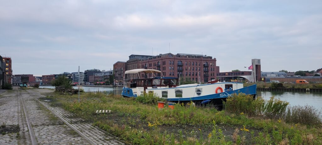 At this point we had been travelling and stressing for over four hours – only to now find that our experiences of traveling upstream on the Rhine paled into insignificance compared to us turning against the outdoing tide in order to access the port on this ebbing tide. Still, with lots of angst, we made it into the port and moored against the harbour wall with large fishing and shrimping vessels opposite and in front of us.