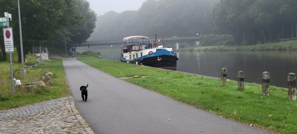 Our next stop later that day, after a mere five hours of travelling, proved to be a lot nicer with a long quay beside the waterway at a small town named Riesenbecker. Still a bit of an issue with passing commercials but clean and tidy, which was many steps up from the previous night. On arrival Alec and I took a walk up into the nearby forest to exercise the dogs. A very pleasant excursion for all of us.