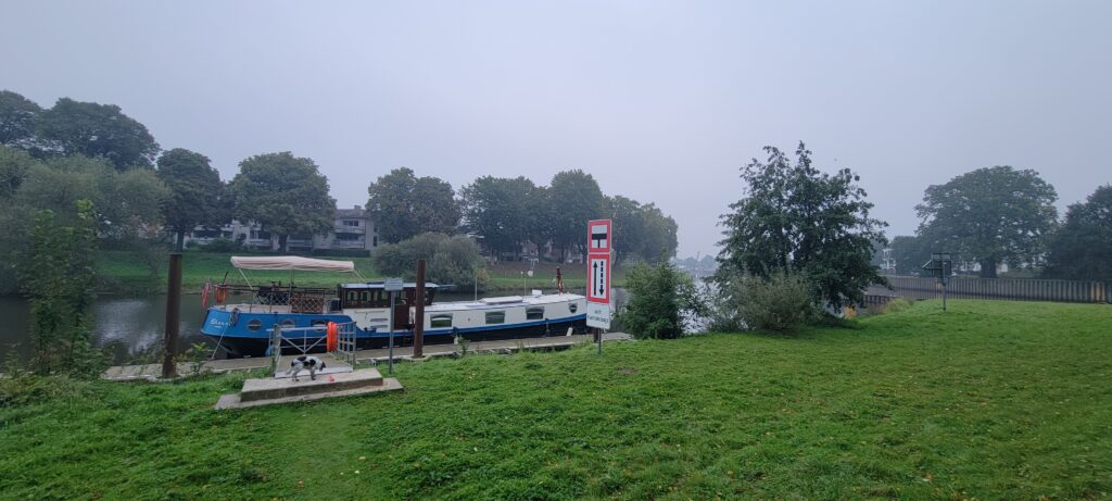 The month was really going by quickly, and already today (18th) it was Alec’s final day with us. Naturally (for him) he made his early swim down the river, with Pip leaping along nearby and even jumping in with him at times. Today was a relatively short cruising day, just for hours and two locks before we reached Meppen, from where Alec was catching a train back to Cologne. It was a direct rail link to the airport where he would catch his flight back to the UK.