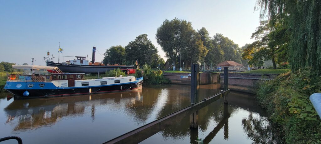 Passing through and with quite a shallow increase in water level we immediately turned into a marina at Papenburg, but decided quite quickly that it wasn’t the one for us, so we turned back round and headed a little further away to the Alfewerft Haven. This marina could only be accessed via a lifting rail bridge but on arriving at the bridge, we were told it was broken. Now what to do! In the end after a few spins in the waterway looking for an alternative, we made for a rough mooring nearby alongside a high stone wall and very close to the rail tracks. We were worried about the noise as trains passed, but they did seem to quieten down and in the end we only heard a few passing toots during the night.