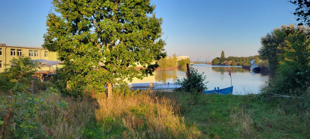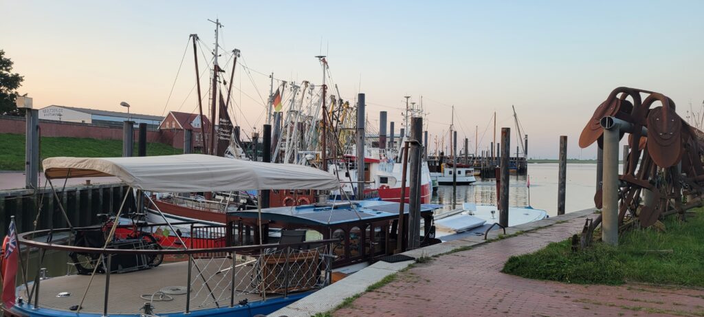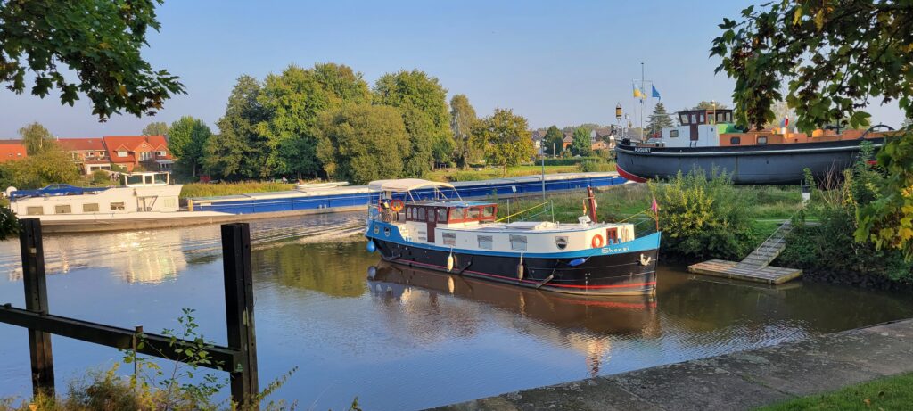 The following day was a slow start for us, as we had to wait once again until 2pm for the one free opening of the lock, but from then on we were travelling with the outgoing tide and breezing along, aiming to stop outside a lock at Oldersum on the tidal section. Unfortunately it turned out that the pontoons weren’t robust enough for a boat of our size, and so we moved on to the fishing port of Ditzum with fingers crossed that we would find somewhere suitable for the night.