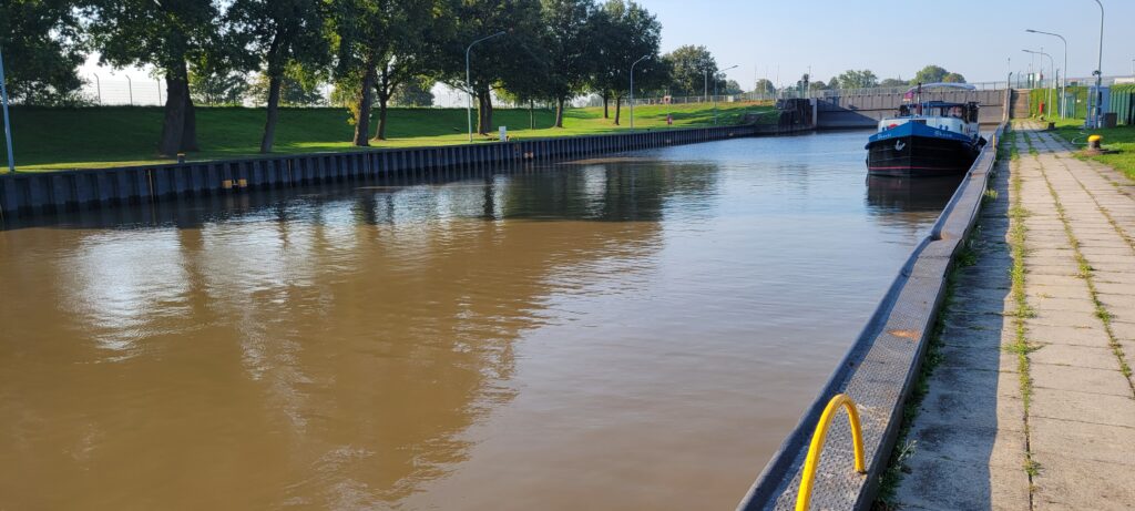 Now a lot more was involved as we were heading onto a tidal route, but that was really our only option as Nicki needed to get back to the UK later in the week. We easily cruised the four plus hours to reach the tidal Schleuse Herbrum at Papenburg, arriving at 1pm. We did however, have to await until 2pm for the lock, the one free opening that day, but it did give us a chance to walk the dogs.