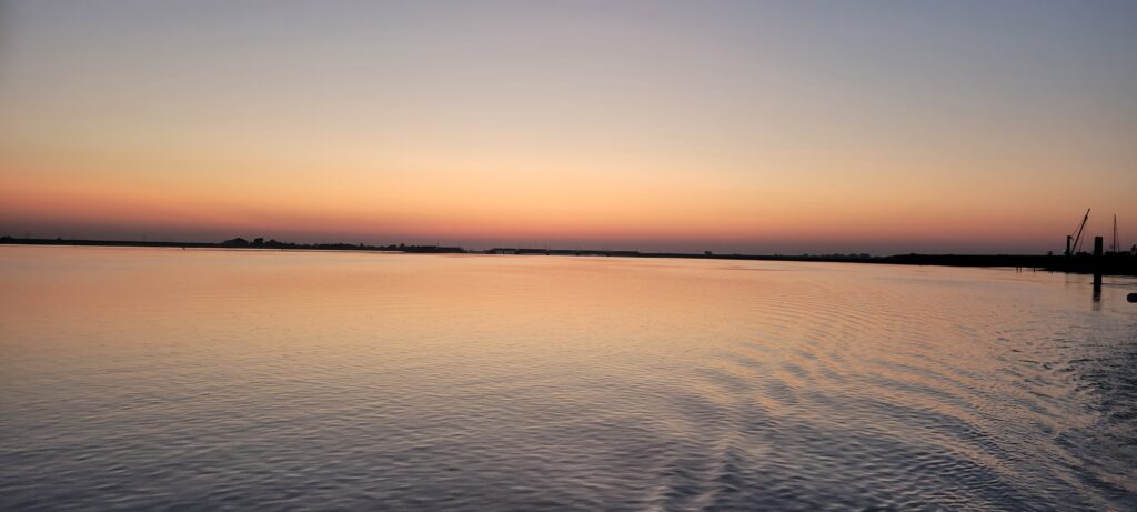Worrying overnight I got up to check the situation again at around 4am. High tide was 4:20am the next day, so with sunrise at 6:30am we were ready to set off by 6.45am to catch the outgoing tide down to Delfzijl.
