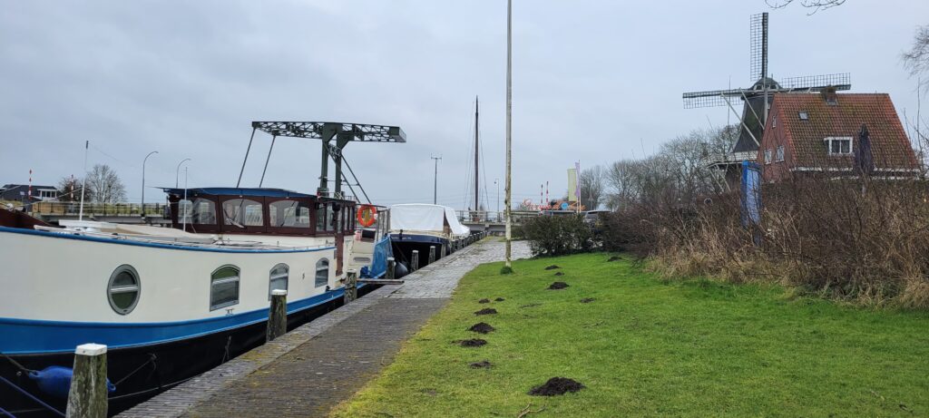 Waking up the next morning – a Sunday – we prepared to move on again, but today the software wasn’t working as we’d expected and wouldn’t play ball …. until we realised that, being out of season, bridges don’t open on a Sunday, a point clearly marked on the software but not noticed immediately by ourselves. So with no other option, we decided to walk the dogs for a while, and then settled down for another peaceful day and night. Garnwerd is a nice little village, composed of just a marina with a large restaurant on site, an old windmill, an ancient church and an ‘exclusive’ restaurant overlooking the river front, so it wasn’t a hardship to stay longer.