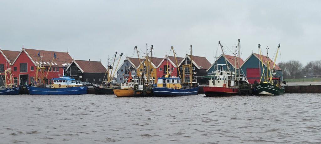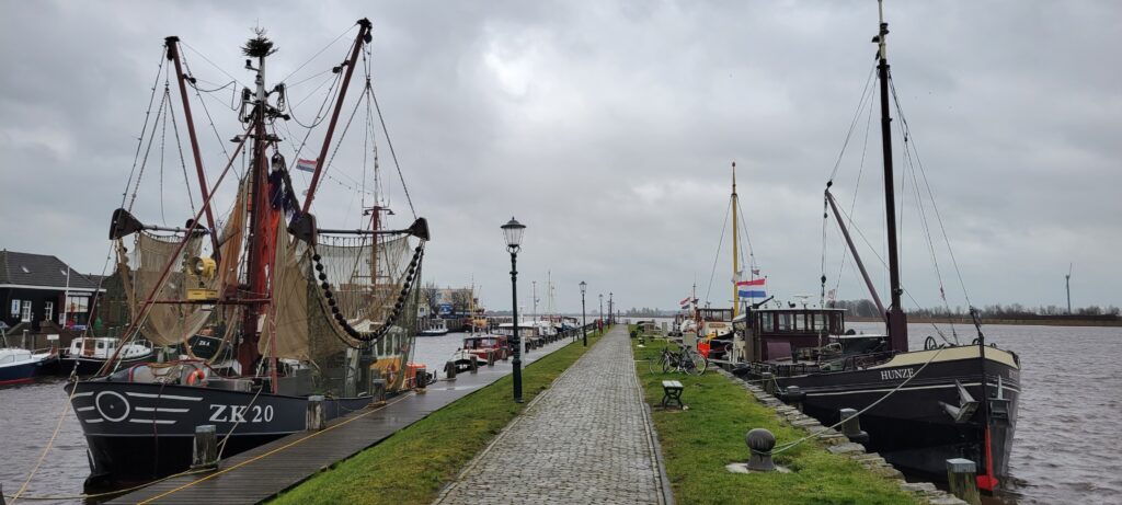 In the morning the weather was grey and damp, but we set off to our next destination of Zoutcamp, a small port on the canal with lots of fishing/shrimping ships moored further along it’s quay and one very interesting vessel ahead of us.