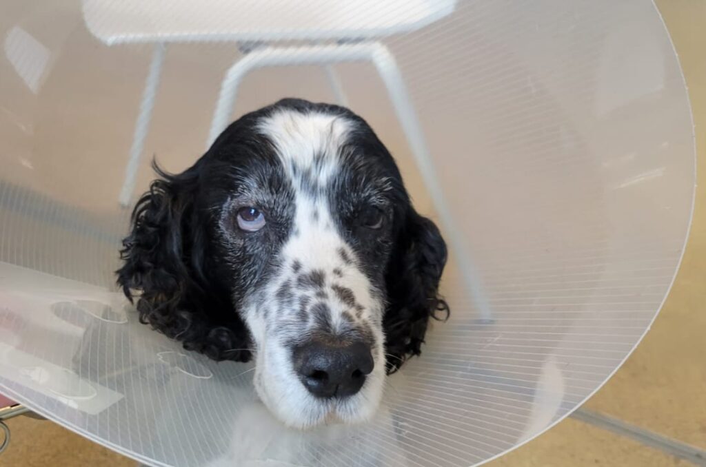 We had never really considered corrective surgery for him in the past, although we know it’s fairly routine for humans to get cataract surgery, but during a visit to a vet in France last year we were told that Casper’s heart and general health seemed very good, and thus he might be a good candidate for surgery to improve his sight – so we decided to explore this option when we got back to Groningen, but these things are never straight forward as it turned out that in the Netherlands cataract surgery on dogs is only performed at specific locations, and our vet suggested a referral to an eye specialist at Utrecht University of Veterinary Medicine, some two hours drive away from our base. Initially our local vet needed to do an ultrasound and health check before making the referral, which all went well and we then made an appointment for 5th February to consult with an eye specialist in Utrecht and assess his eyes for surgery. There, we were seen by a year one and a year five student, who spent some time questioning us on his general health and then performing various simple eye tests. As anyone who knows Casper will be aware, he is a really placid dog so didn’t struggle at all …. until a test for tear duct production was performed, which was not optimal. Eventually however we went through to see the eye specialist, who already had a group of students with her. She examined Casper in much more detail and discussed the initial findings with her students and ourselves, and after a fairly lengthy consultation, she requested an ultrasound of his eyes, which we arranged for the afternoon – as we have already mentioned, Casper is very placid and amazingly they performed the ultrasound on his eyes with no sedation. Thankfully this was all good and the students reported that the consultant was happy with the outcome and prepared to do the surgery, but first she required a series of further blood tests plus a liver and spleen biopsy to be carried out to confirm that Casper’s blood would clot properly. These were mostly standard tests, although a biopsy of his liver and spleen were ordered since an initial ultrasound at our local vet had identified some anomalies. It was agreed that we could arrange these with our local vet as it was impractical to keep visiting the University. Before leaving the University we were prescribed medications to improve his tear duct function, along with a series of medications for use four days prior to the operation.