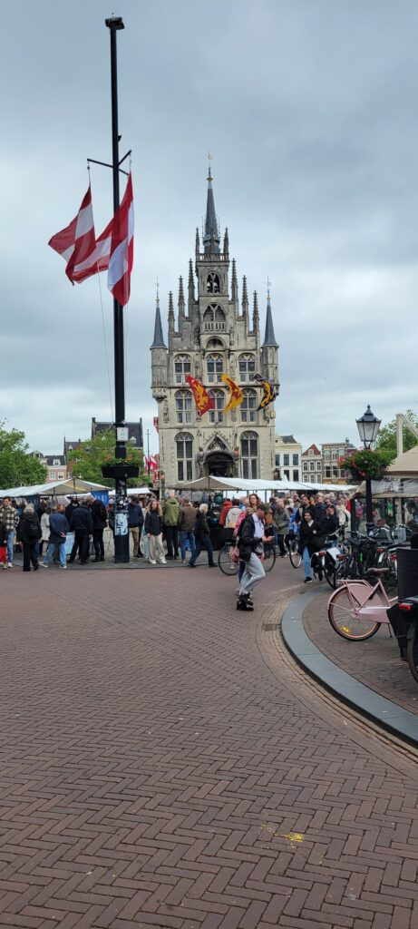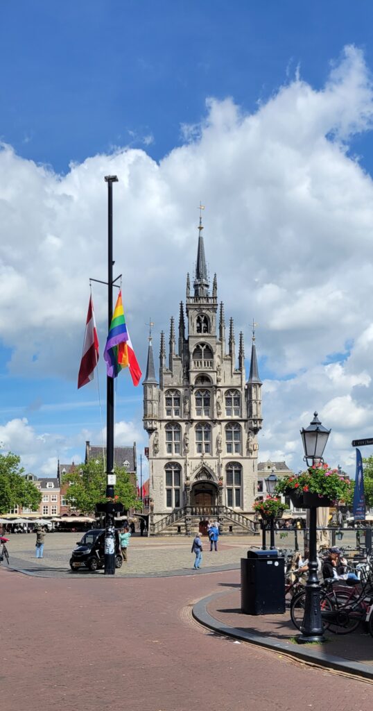 Now nearing the end of May, we moved on again on 28th and joined the Turfsingelgracht which took us along to the flood gate/sluis entry into Gouda itself, where we moored inside of the town centre at the Guldenbrug for two nights.