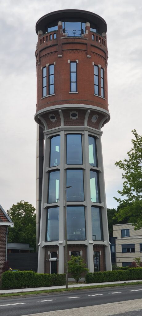 Passing along the river and very close to our mooring we noticed an eye-catching tower that was definitely worth a little research – we discovered that it was a water tower built back in 1915 designed with an open substructure of eight tapered concrete legs supporting a brick superstructure/reservoir. The water tower functioned until 1985, after which it remained empty until it was privately purchased around 1999. Between then and 2003 the structure was extensively renovated as office accommodation – the open spaces between the legs were closed with glass, a round glass structure was placed on the reservoir and an external elevator was built to the tower. In 2022, a pavilion was built at the foot of the tower for extra office space.